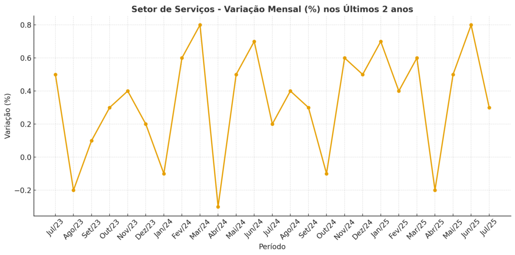 O setor de serviços no Brasil avançou 0,3% em julho de 2025 na comparação com junho, segundo dados da Pesquisa Mensal de Serviços (IBGE). Este é o sexto mês consecutivo de resultados positivos, e o volume de serviços alcançou o maior nível da série histórica iniciada em 2011.