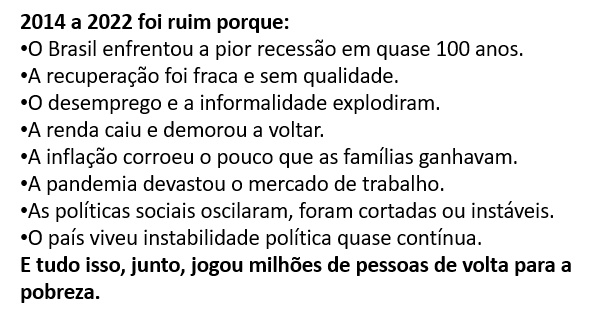 Mas esse ciclo virtuoso foi seguido pelo período mais duro desde os anos 1980. A partir de 2014, entramos numa tempestade perfeita, econômica, política e sanitária, que desmontou boa parte dos avanços. A pior recessão em quase um século, a informalidade crescente, a inflação insistente, o achatamento da renda e a pandemia reconfiguraram o mapa da pobreza.