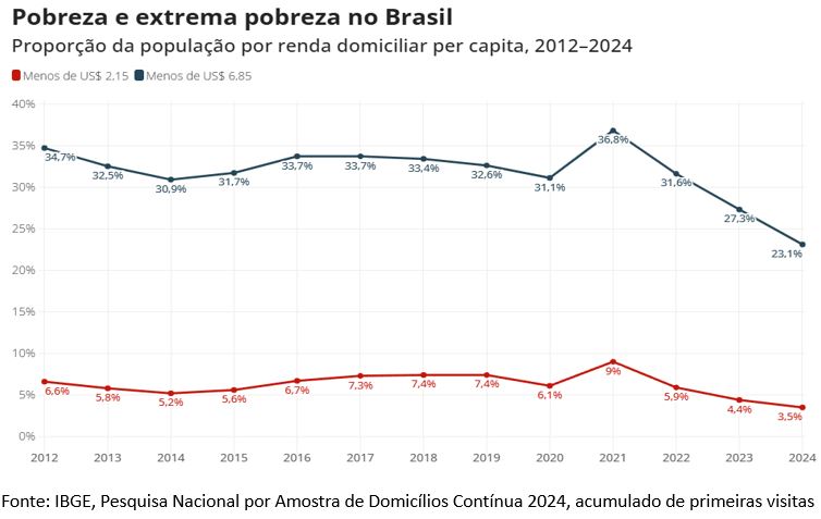 O Brasil alcançou, em 2024, os menores níveis de pobreza e extrema pobreza desde o início da série histórica do IBGE, em 2012. Mas a explicação para esse marco não cabe em narrativas simplistas. A melhora observada nos últimos anos é resultado de um ciclo longo de construção institucional, iniciado no começo dos anos 2000, ampliado por políticas sociais, fortalecido pelo mercado de trabalho e acelerado recentemente pela recomposição da renda dos mais pobres. A queda da pobreza não é mérito exclusivo de um governo, é fruto de 25 anos de políticas públicas, ciclos econômicos, disputas políticas e decisões estratégicas sobre salário mínimo, emprego, Previdência e programas de transferência de renda.